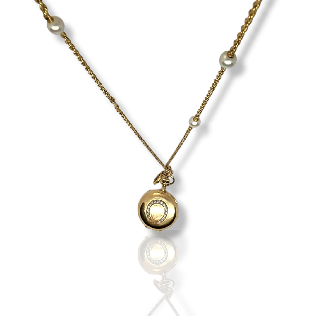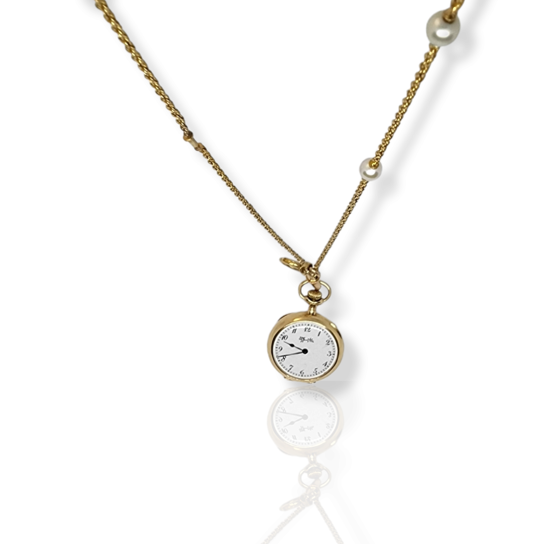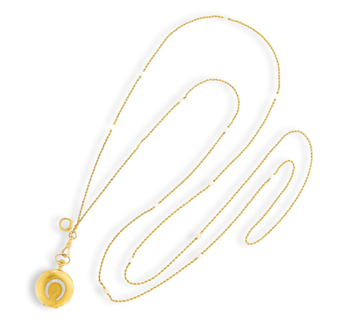 Antique 19th century Tiffany & Co gold, platinum and diamond watch pendant and 18kt gold and pearl long chain necklace
