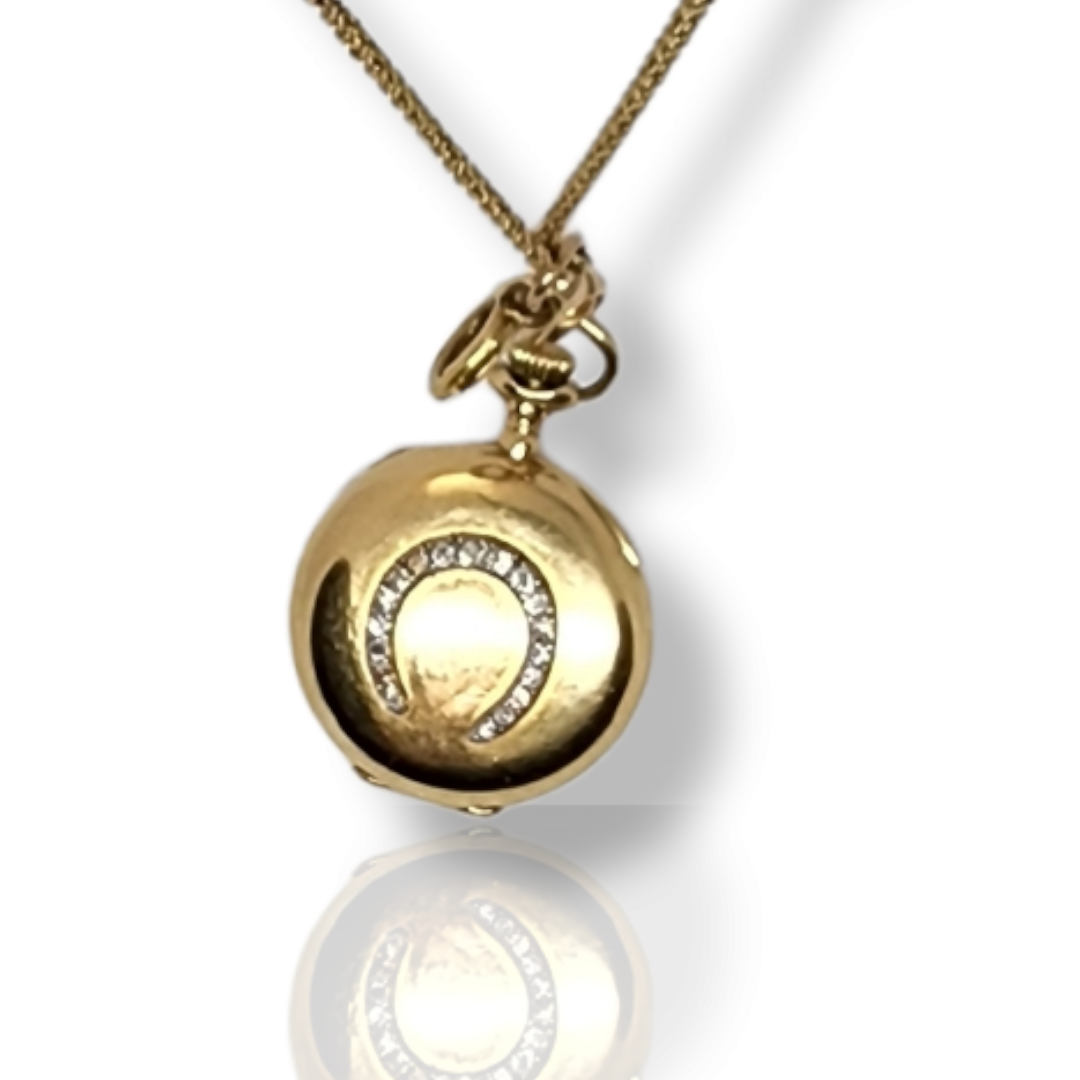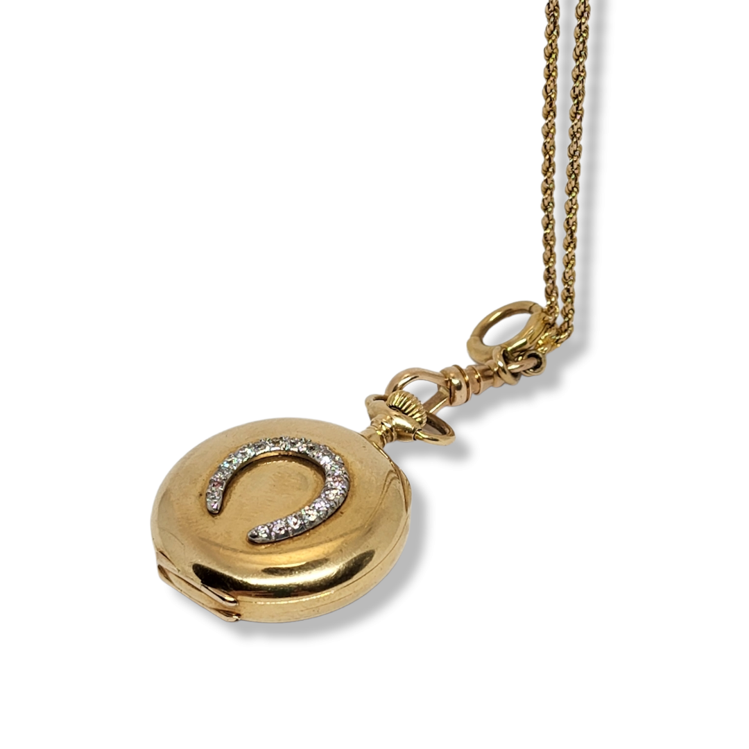 Case: polished round, case back with diamond-set lucky horseshoe motif