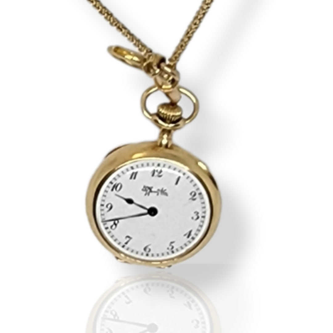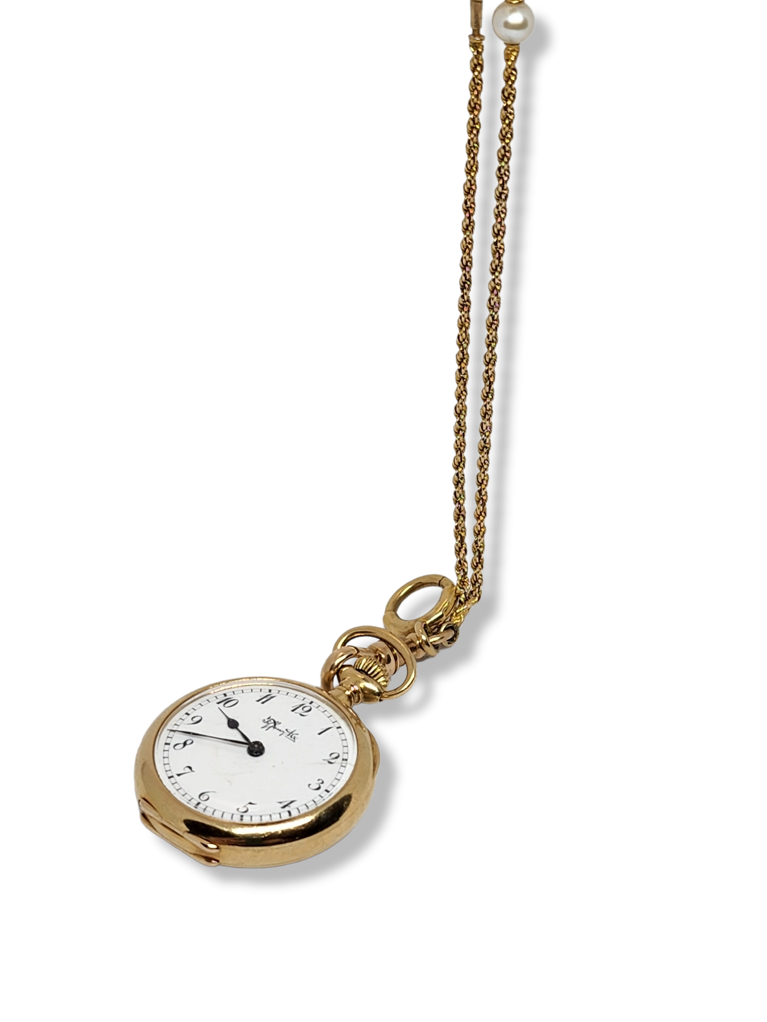 The watch is suspended from a long rope-twist chain, 13 pearls ap. 4.5 mm., ap. 43 GR gross. Length 135 CM.