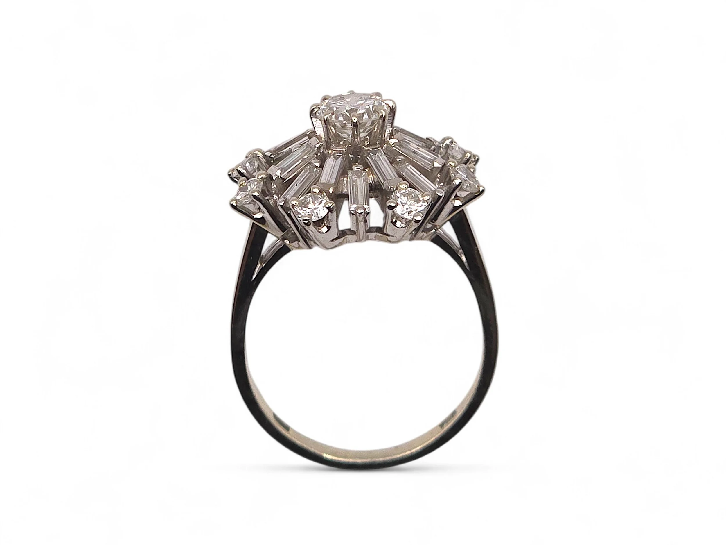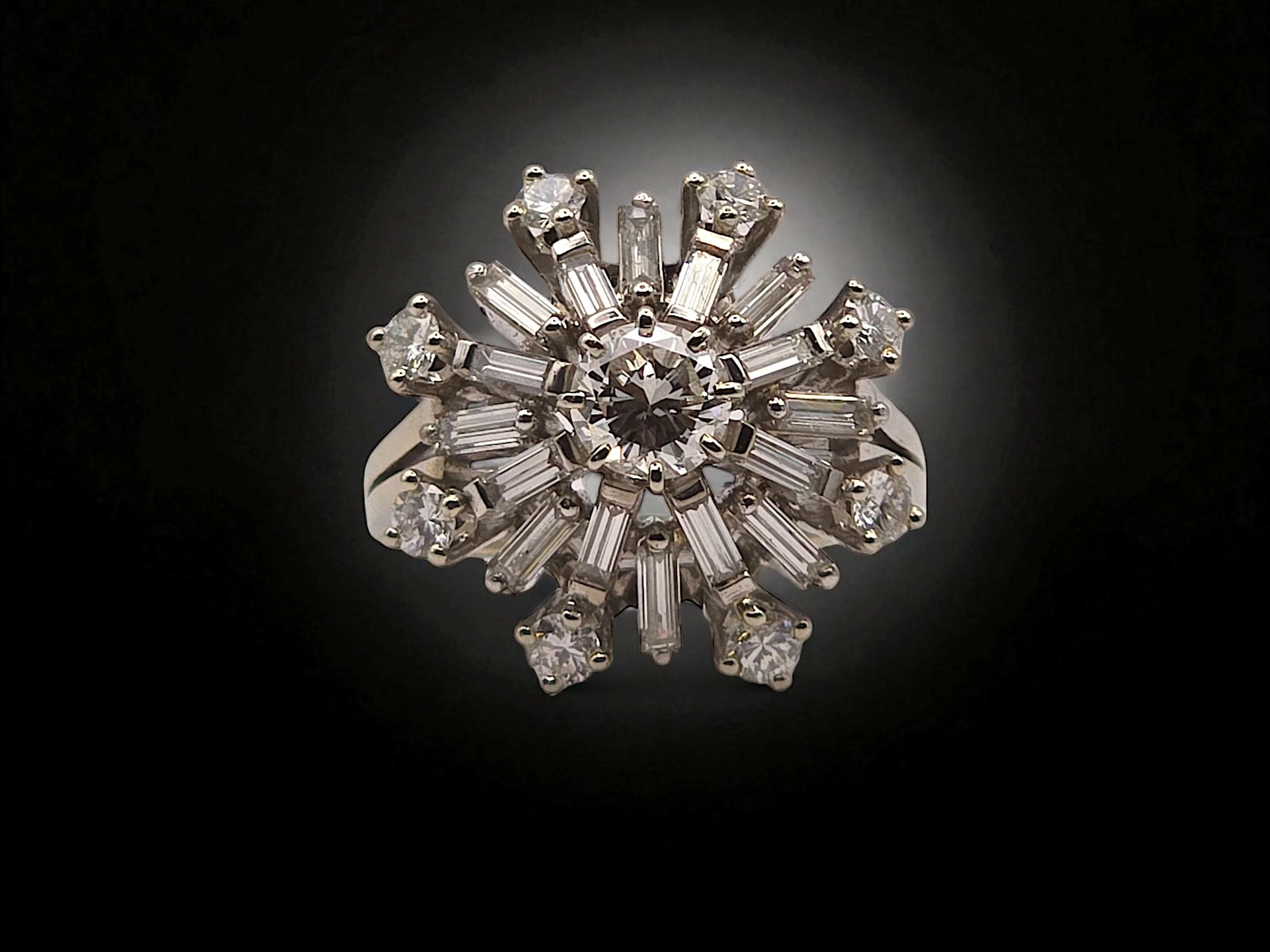 Transform any occasion into a moment of elegance with this dazzling Vintage White Gold Diamond Snowflake Ring, inspired by mid-century design. Crafted to resemble the beauty of a snowflake, this ring is a tribute to timeless style and sophistication.
